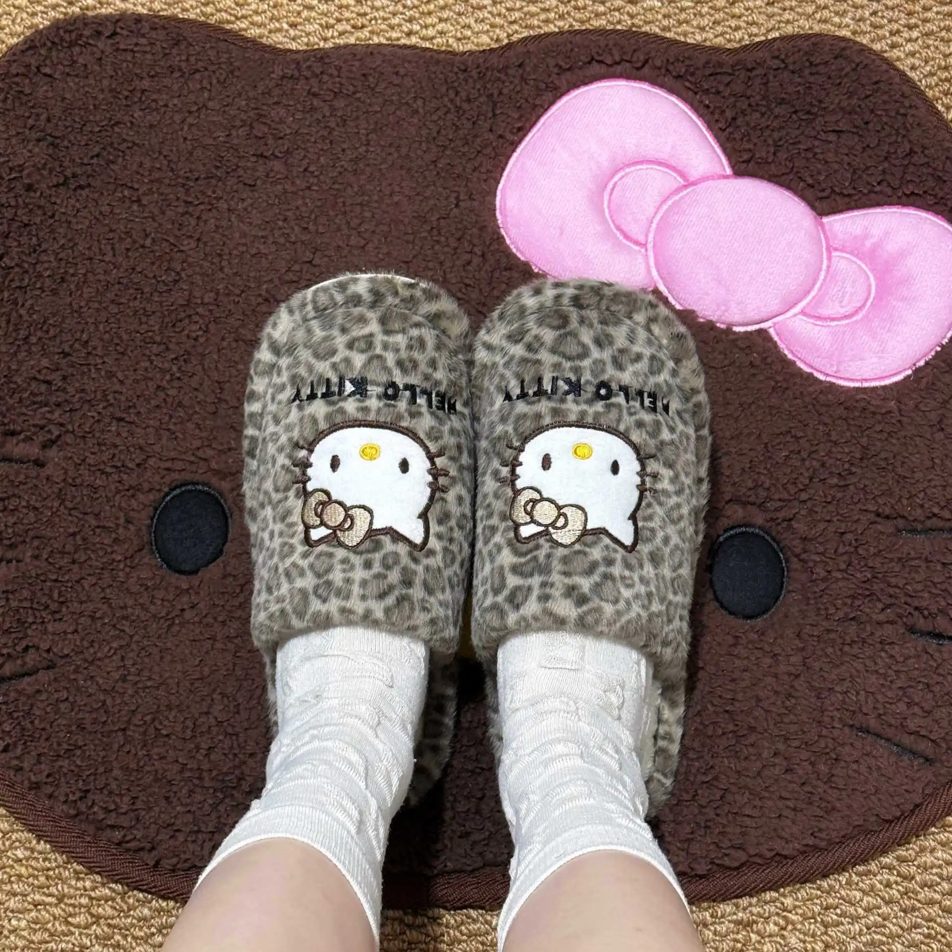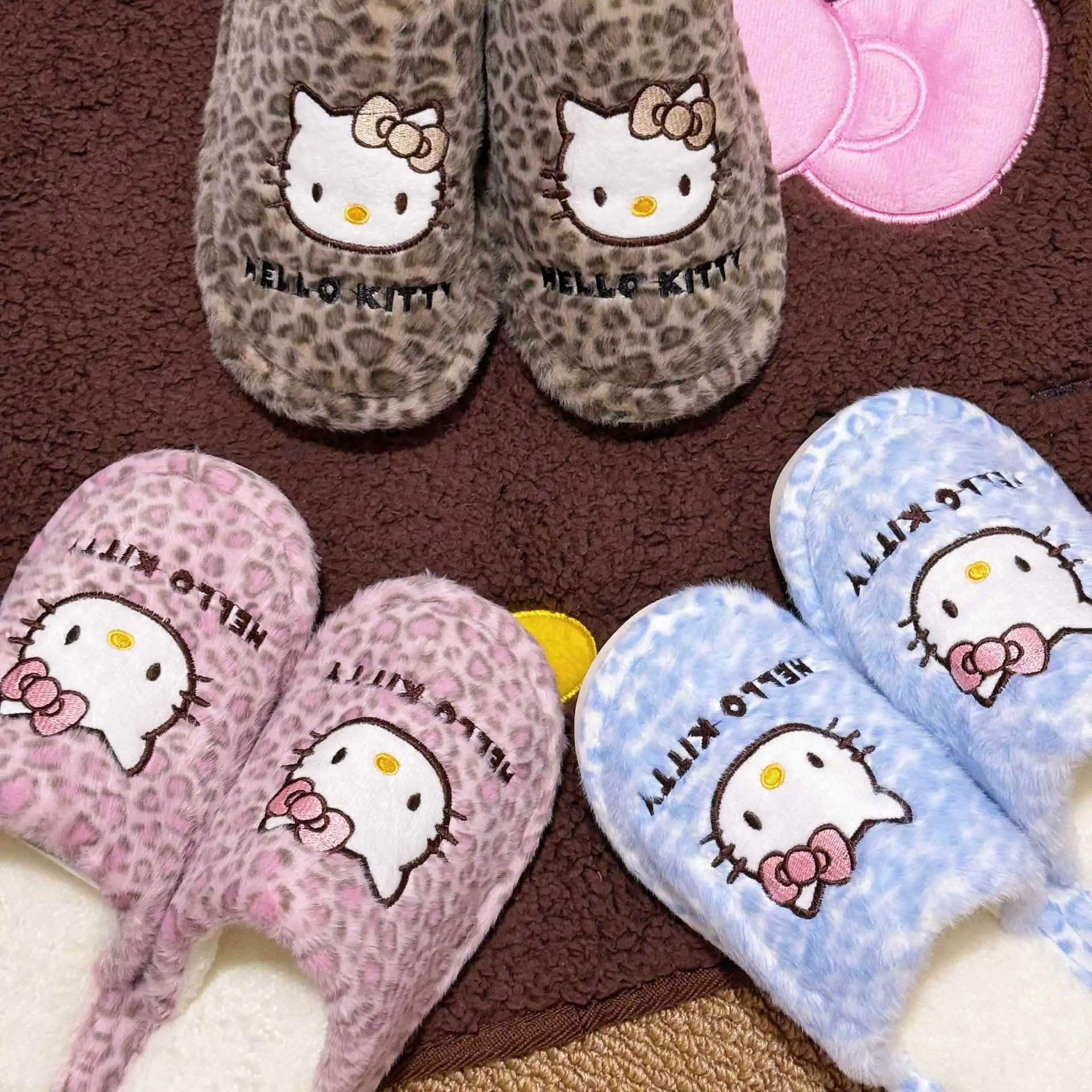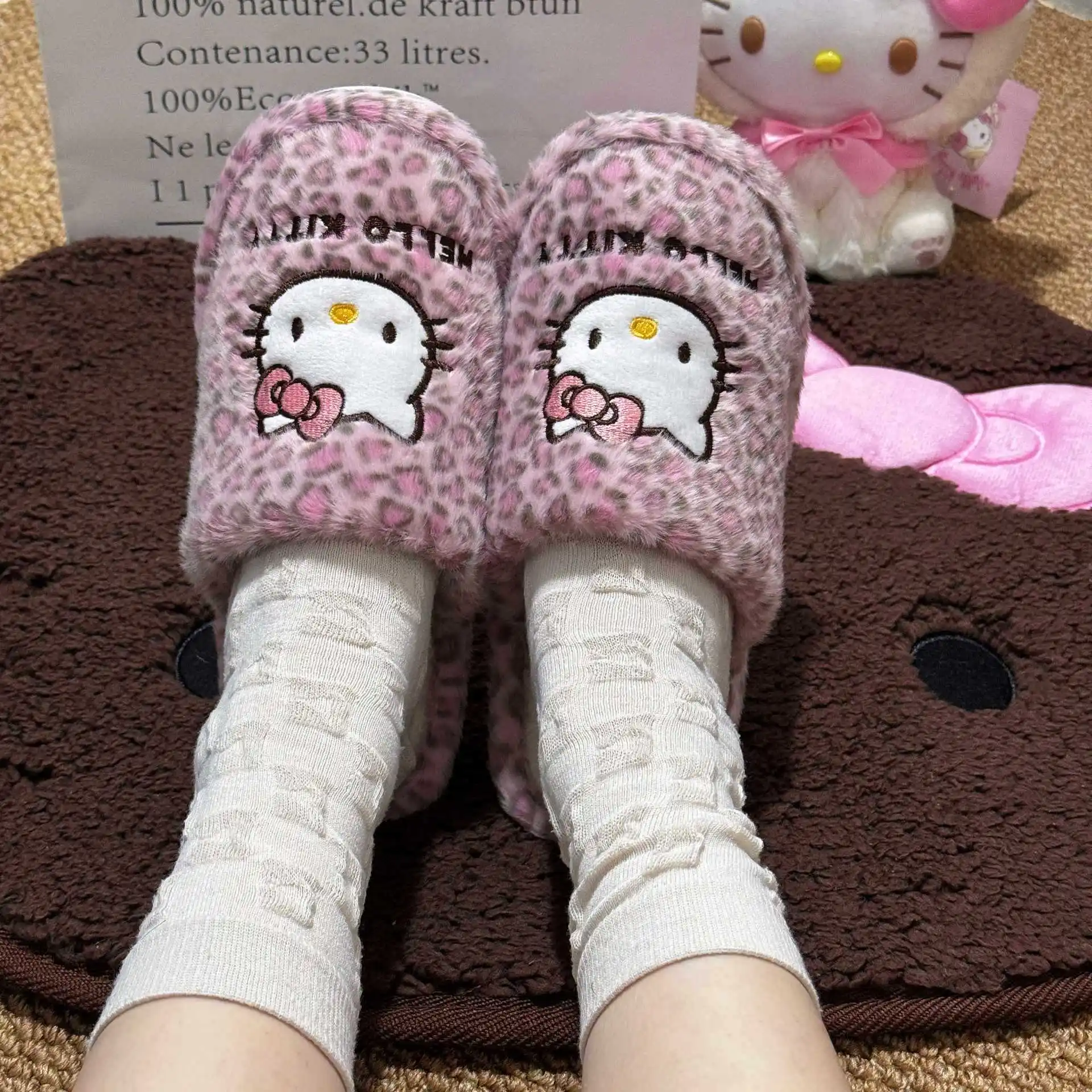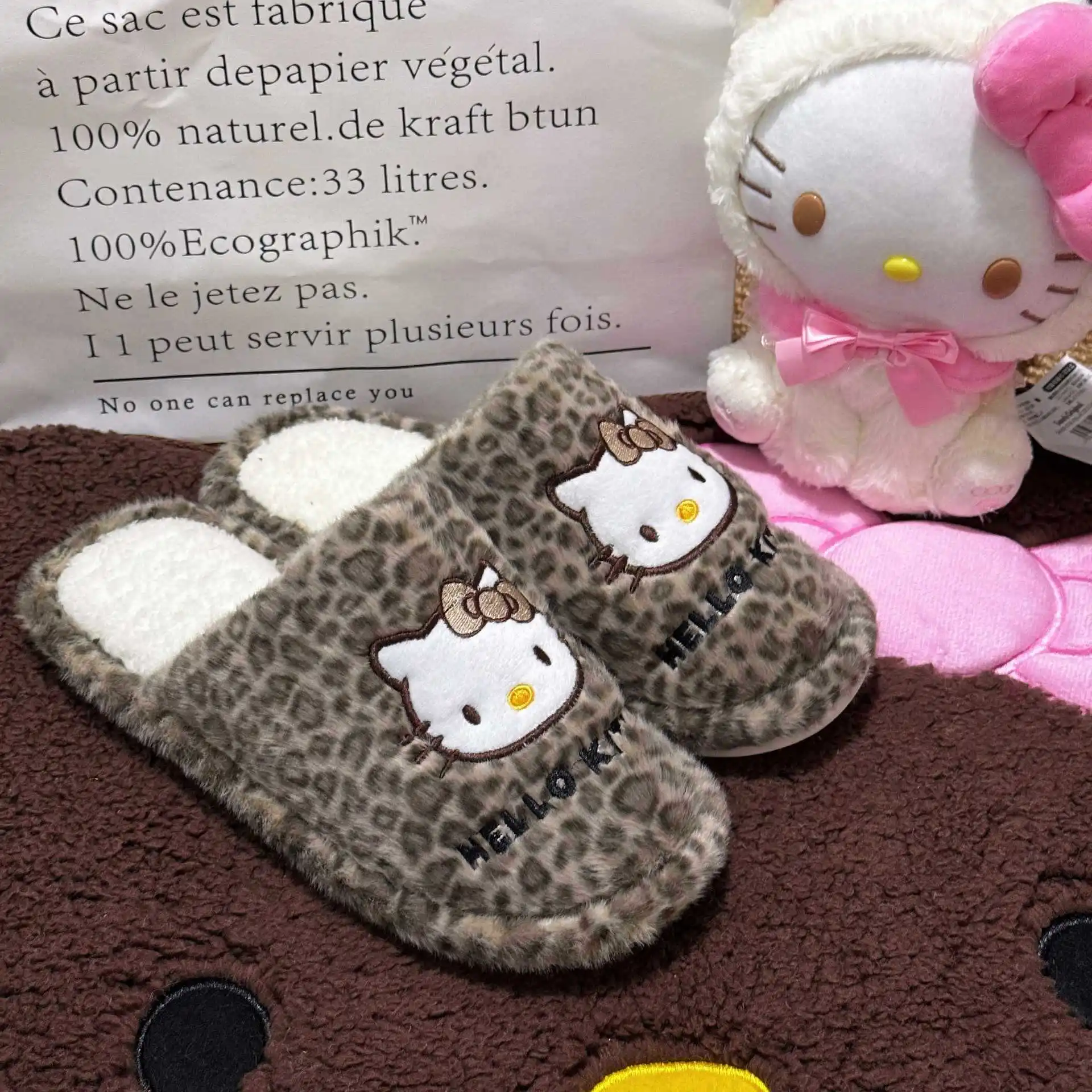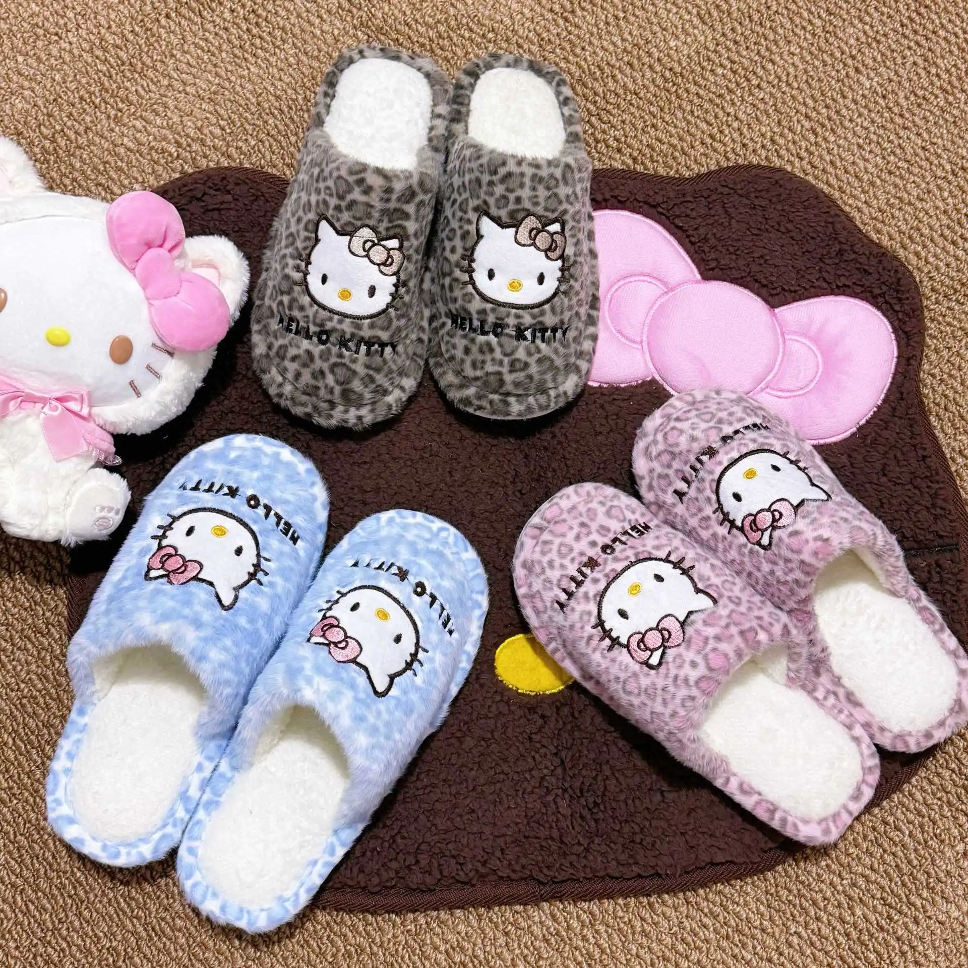 Hello Kitty Cartoon Indoor Leopard Print Slippers for Home Use Winter Warm Non Slip Cotton Slipper Birthday Gift for Girl