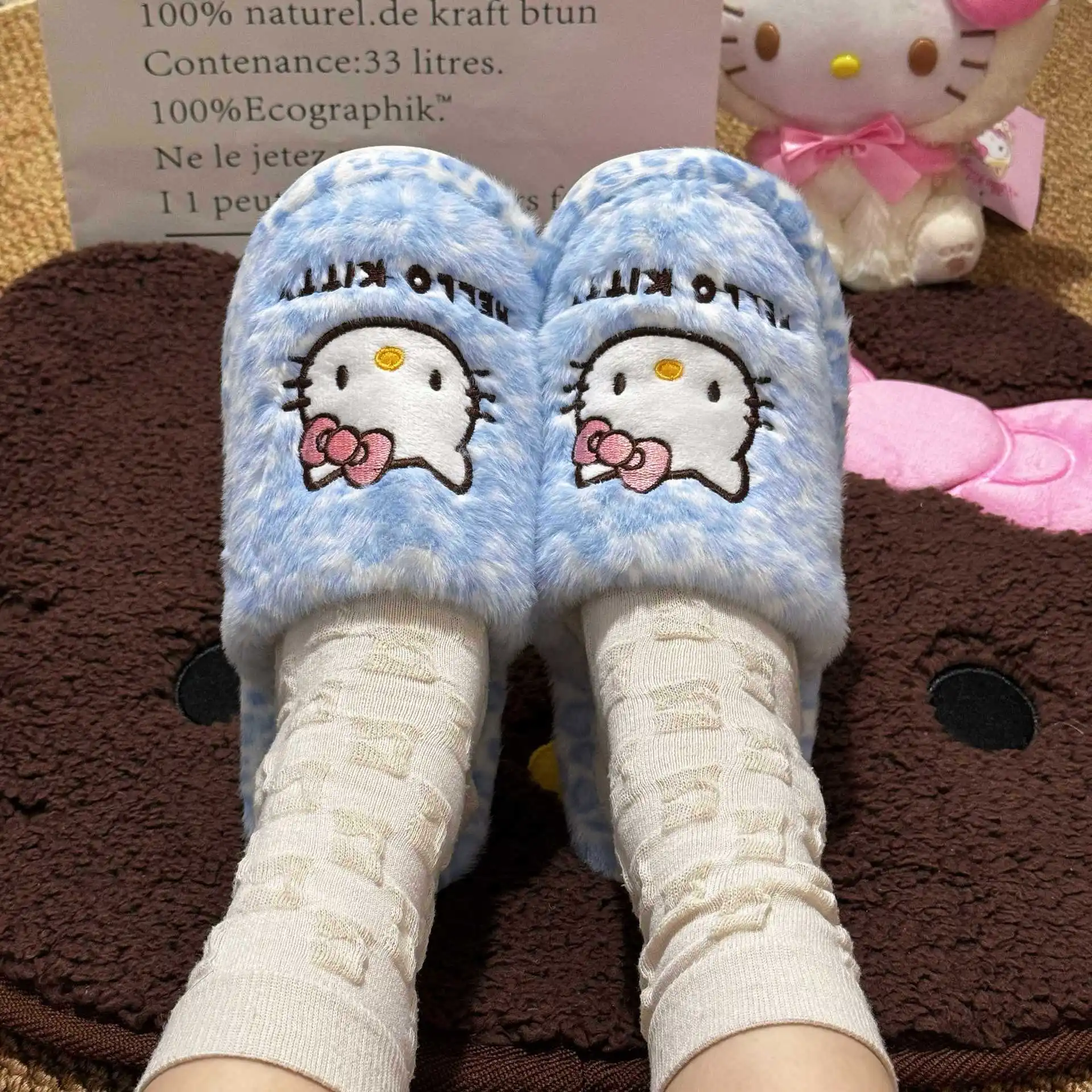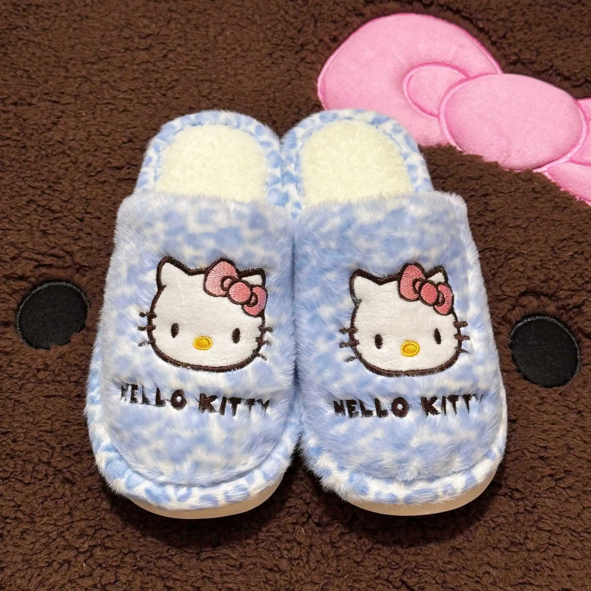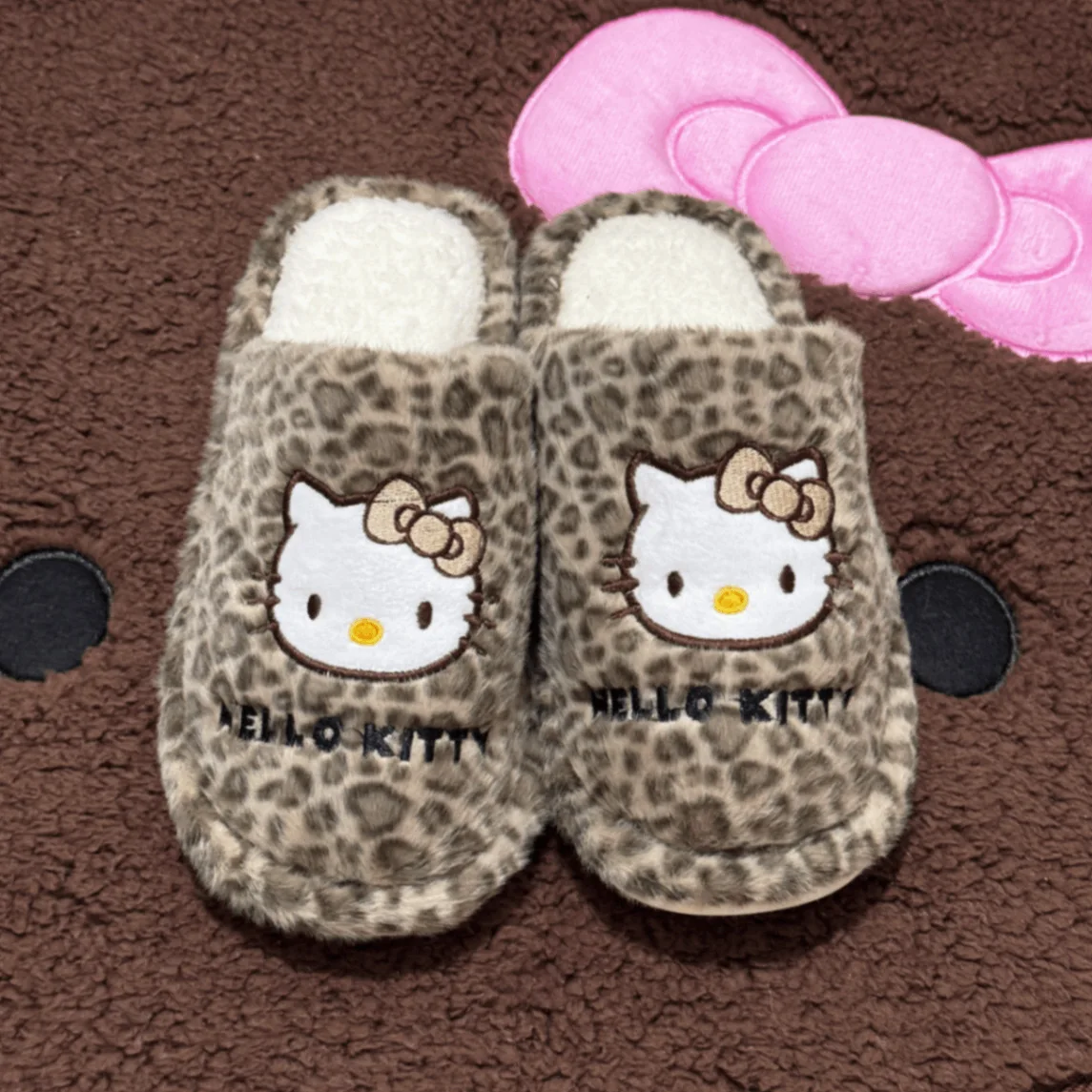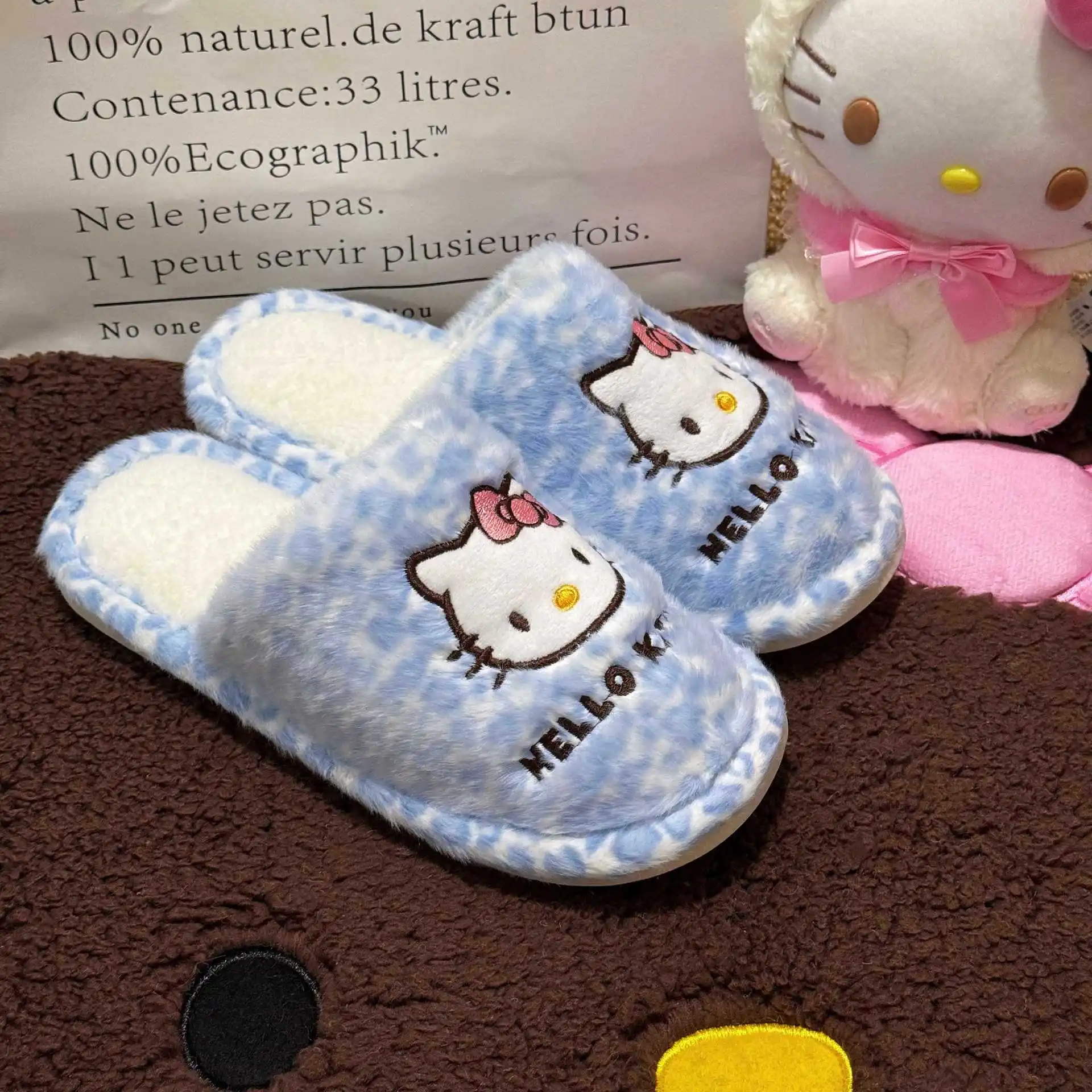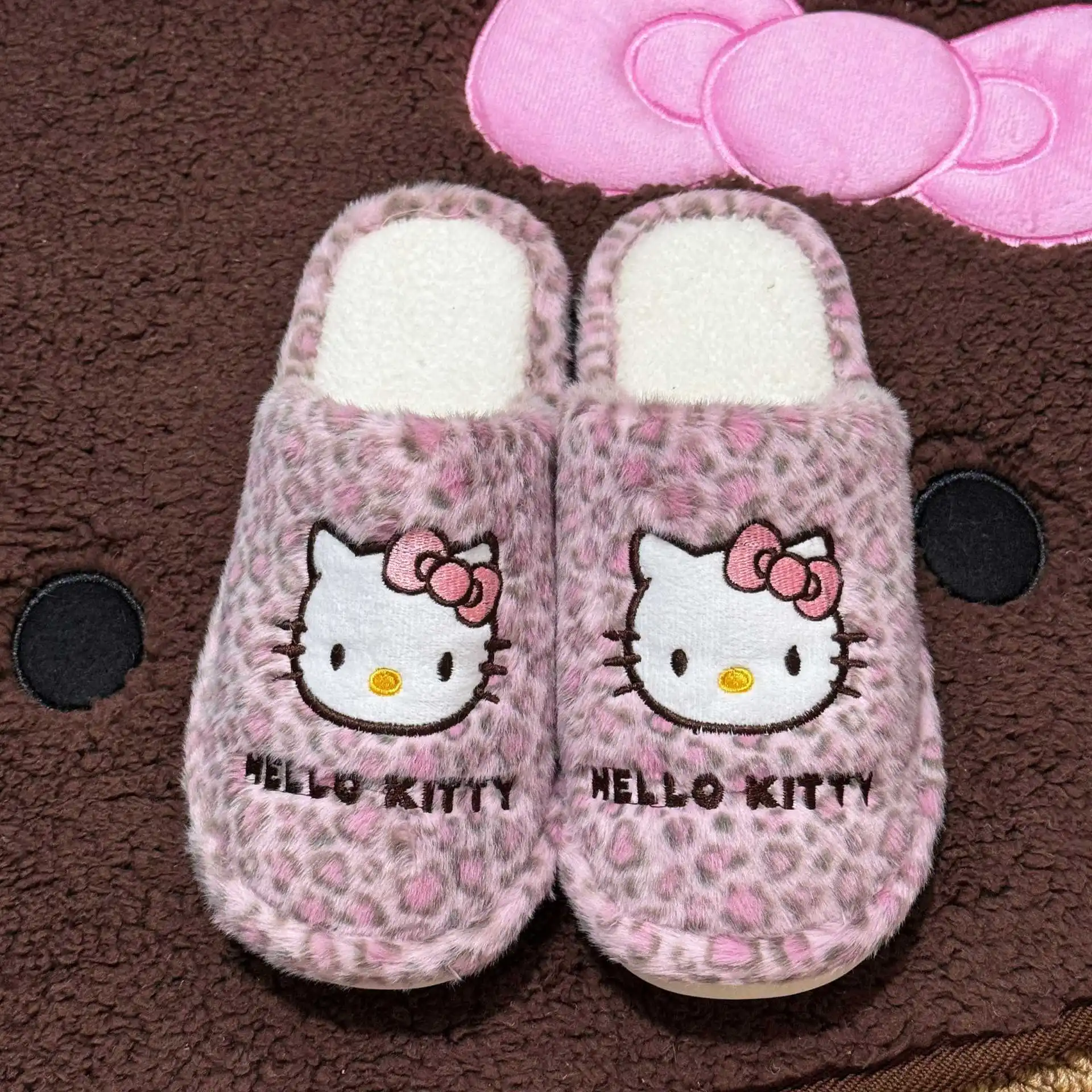 Hello Kitty Cartoon Indoor Leopard Print Slippers for Home Use Winter Warm Non Slip Cotton Slipper Birthday Gift for Girl